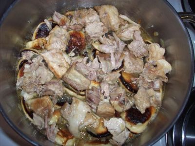 Вынимаем его из соуса, очищаем от костей и нарезаем не очень крупно.