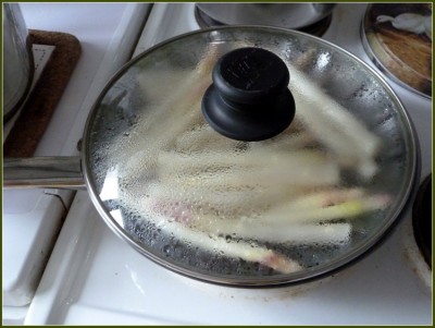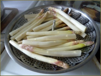 В широкую низкую кастрюлю или сковородку наливаем вино ( или вино пополам с водой), добавляем нарезанную луковицу и перец горошек. Доводим до кипения, ставим сверху приспособление для варки на пару и выкладываем на него спаржу.