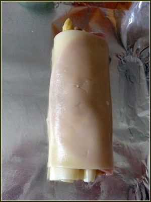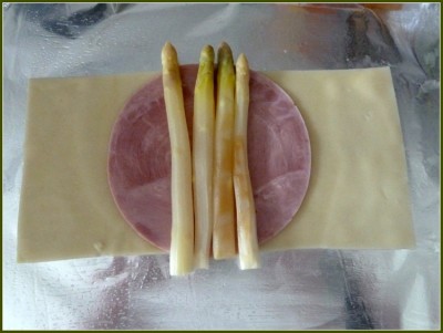 Выкладываем на фольгу лист лазаньи, на него ломтик ветчины, сверху 3-4 штучки спаржи