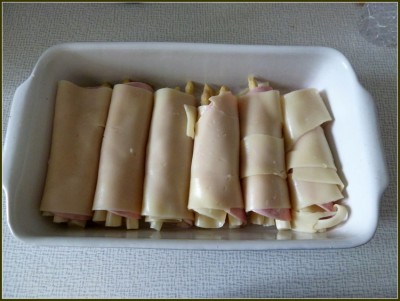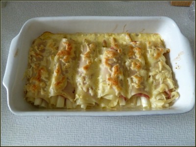 Если у нас осталось немного жидкости, над которой варилась спаржа, процеживаем её, добавляем сливки, соль, мускатный орех и заливаем этим соусом конвертики в форме. Если жидкости не осталось, увеличиваем количество сливок или добавляем к ним немного молока.