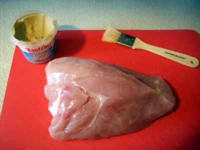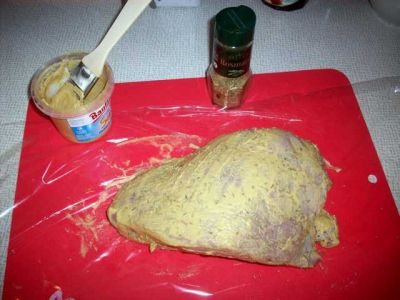Первым делом мясо нужно замариновать. Для этого смазываем его горчицей и посыпаем розмарином. (В рецепте ещё предлагались такие специи, как тимьян и шалфей, но у меня их не было)