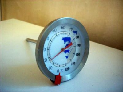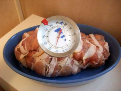 Осталось переложить мясо в форму и вставить термометр. Термометр вставляется в самую толстую часть куска мяса, так, чтобы остриё оказалось в самой середине куска.