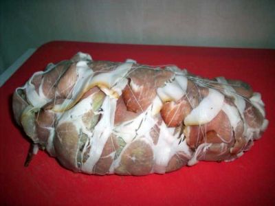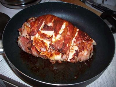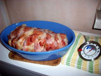 Теперь оборачиваем наш кусок полосками бекона и обвязываем нитками, чтобы зафиксировать бекон.
