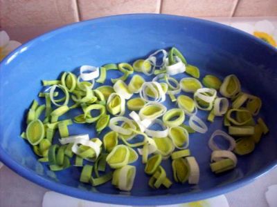 Остальной лук-порей режем на колечки и выкладываем на дно огнеупорной формы.