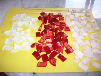 Сало, лук и перец нарезаем небольшими квадратиками.