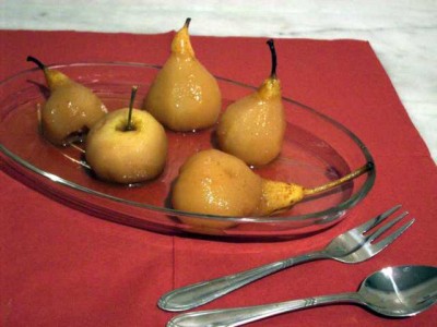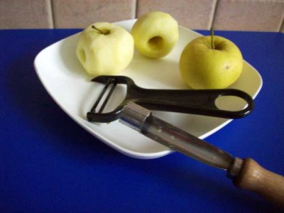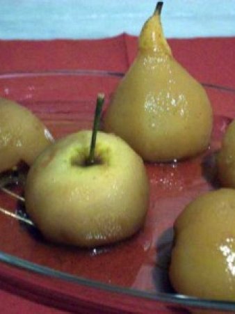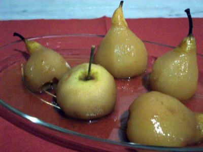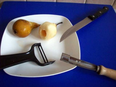 Берём мелкие груши и яблоки и подготавливаем их таким образом: чистим от кожуры и аккуратно вынимаем сердцевинку, оставляя при этом верхнюю часть с плодоножкой нетронутой.