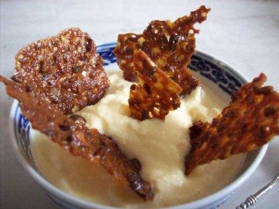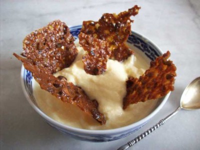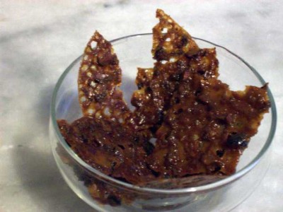 А можно подать с каким-нибудь кремом или украсить ими торт. Только если украшать торт, то непосредственно перед подачей на стол, потому что эти кружева от соприкосновения с влажным кремом начинают таять