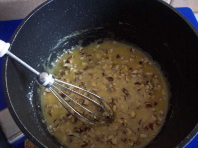 Снимаем с огня. Добавляем муку и орехи. Хорошо перемешиваем.