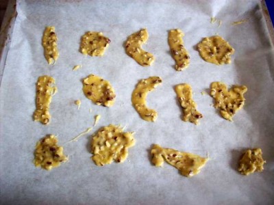 Я попыталась придать этим кусочкам разную форму, но, как оказалось, это был мартышкин труд, потому что после того, как они провели в духовке положенные им 5 минут, всякую форму кусочки потеряли.