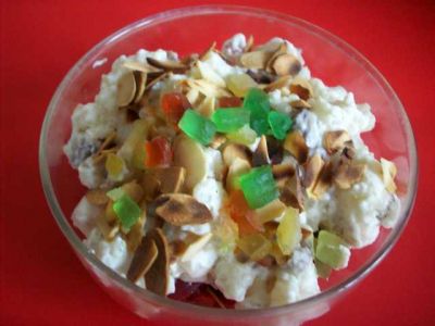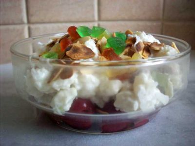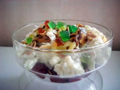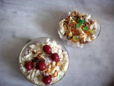 Для этого взбиваем сливки с 1 ст. ложкой сахара до густоты, добавляем их в рис и перемешаем.
