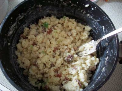Теперь его нужно охладить. Остывший рис выглядит "склеенным". Это легко исправить с помощью вилки.
