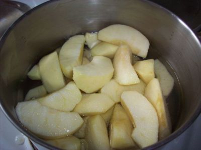 Их тоже моем, чистим от кожуры и семян, нарезаем, заливаем водой, так, чтобы верхний слой не был покрыт водой и пусть себе варятся. В это время на сцене появляются герои "второго плана" - 1 столовая ложка сахара и сок половины лимона. Им самое место в кастрюле с яблоками.