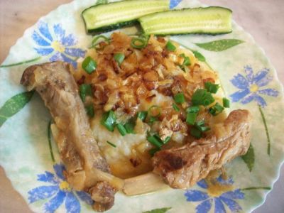 Так что я обошлась просто тушёными свиными рёбрышками и малосольным огурчиком...