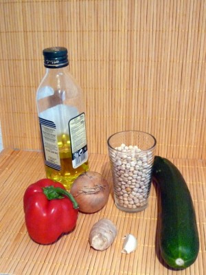 Луковицу покрупнее, а цуккини и перец кубиками 1-2 см