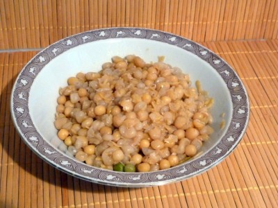 Добавляем к обжаренным овощам отваренный горох, соль, перец и прогреваем всё вместе ещё пару минут
