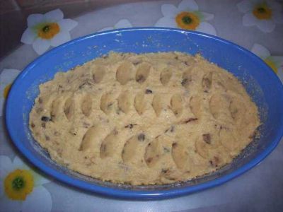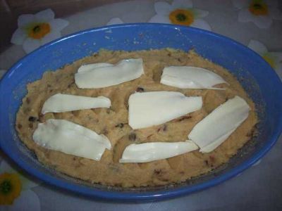 Раскладываем по поверхности тоненькие кусочки сливочного масла и отправляем форму в духовку.