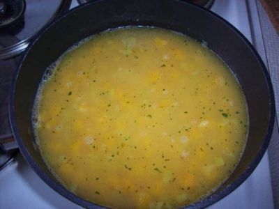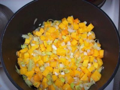 В толстостенной кастрюле обжариваем минут 10 лук, чеснок и тыкву на растительном масле