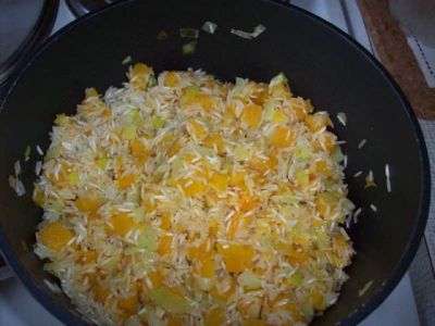 Добавляем рис, хорошо перемешиваем и обжариваем всё вместе ещё пару минут
