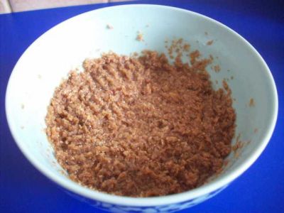 Всё перемешиваем. Если масса получилась слишком жидкая, можно добавить 1-2 столовые ложки муки.