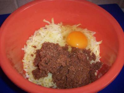 Картошку отвариваем в мундире, чистим и разминаем. Если же у вас (как у меня в этот раз) вчерашняя холодная картошка, её проще натереть на тёрке.