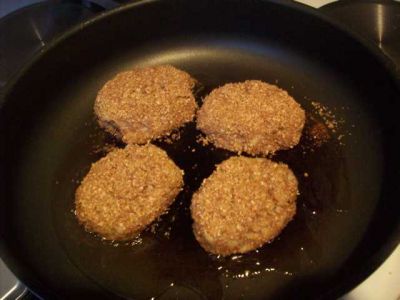 Обваливаем их в сухих отрубях и обжариваем на растительном масле с обеих сторон до румяной корочки.