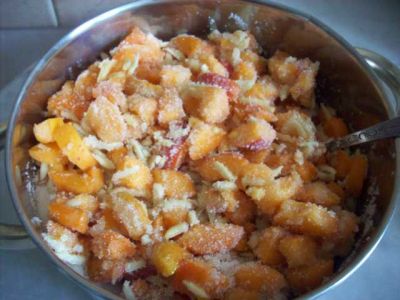 Складываем в просторную посуду для варки варенья, добавляем сахар, мёд, миндаль. Всё аккуратно перемешиваем.