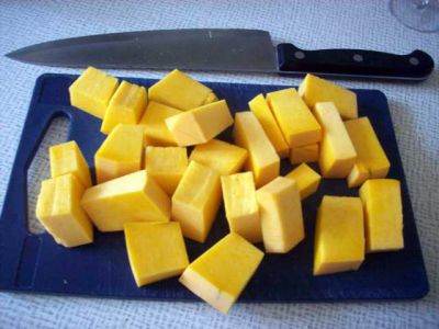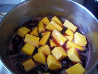 Теперь пришла очередь тыквы. Режем её на кубики размером 1,5-2 см и тоже отправляем в кастрюлю с вареньем.