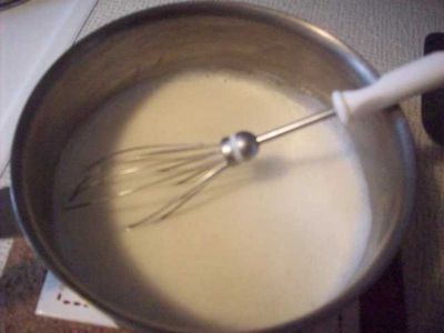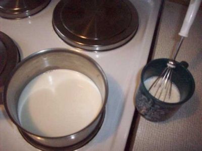 Когда молоко в кастрюльке начнёт закипать, вливаем туда тоненькой струйкой молоко с крахмалом и не забываем при этом содержимое кастрюльки постоянно помешивать.