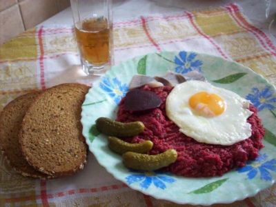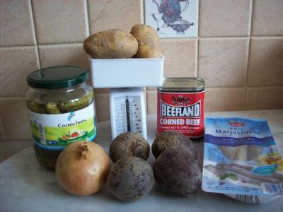 И ещё. Есть разные методы приготовления Лабскауса. Часто его делают без мясорубки. Отварную картошку разминают в пюре, а все остальные составляющие просто мелко нарезают.