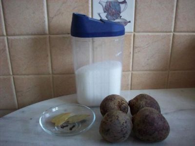 Отвариваем мясо. Если вы, как и я, используете консервы, то переходим сразу к следующему этапу. Отвариваем свеклу с добавлением 100 гр сахара, двух гвоздичек и лаврового листа. Тут я немного отступила от рецепта, т.к. в нём предлагали варить очищенную свеклу, а я сварила её в мундире. Мне так больше нравится.