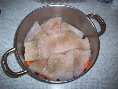 На овощи кладем куски рыбы.
