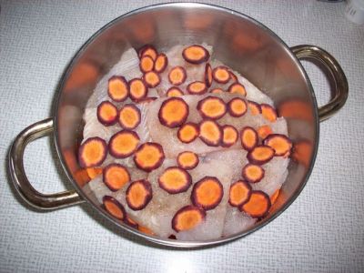 Выкладываем на дно широкой кастрюли в таком порядке: