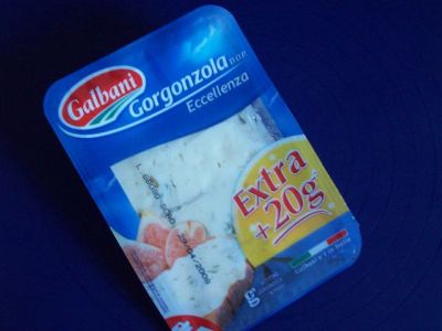 Так выглядит сыр с плесенью Горгонзола. Если он у вас не продаётся или вы его не любите, можно заменить козьим сыром или другим мягким сыром с ярко выраженным вкусом.