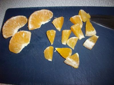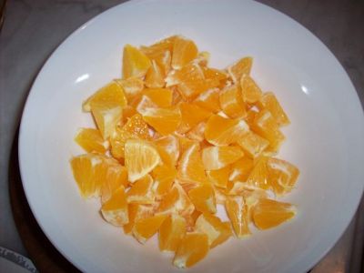 Апельсины очищаем от кожуры, разбираем на дольки и тоже нарезаем.
