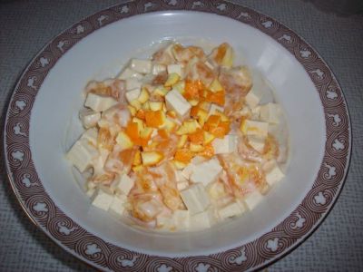 Тофу готовится из соевого молока. Очень богат белками - заменяет мясо в вегетарианской кухне. Лёгкий, нежный, с нейтральным вкусом. Подходит и для салатов, и для супов, и для запеканок. Можно его поджарить и подать с гарниром. Но мне больше всего нравится он именно в этом салате.