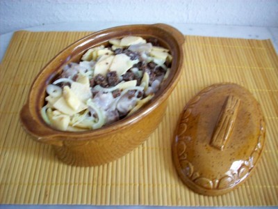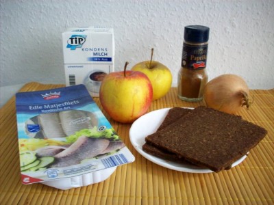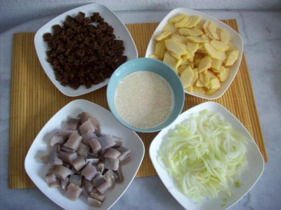 Теперь перекладываем лук, яблоки, селёдку и хлеб в кастрюльку или салатницу.