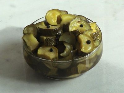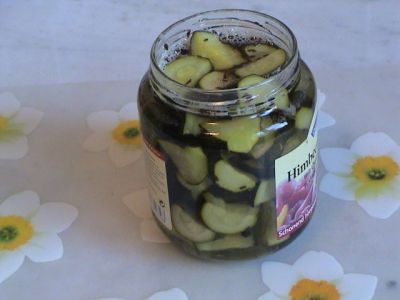 Когда все цуккини будут в банке, залить их горячим маринадом.