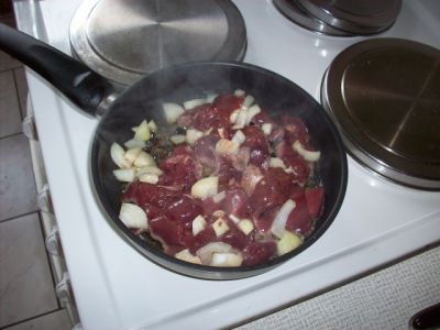Растапливаем на сковородке кусочек сливочного масла и слегка обжариваем на нём печёнку с луком.