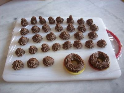 Теперь застилаем досточку пищевой пленкой и при помощи кондитерского шприца делаем вот такие "конфетки".