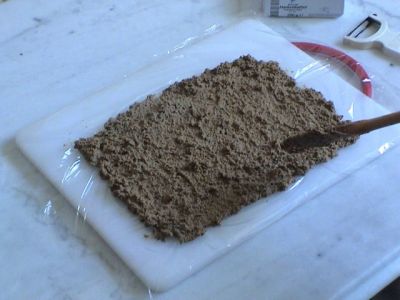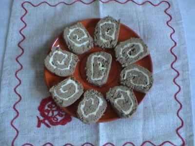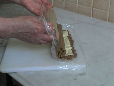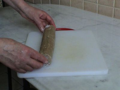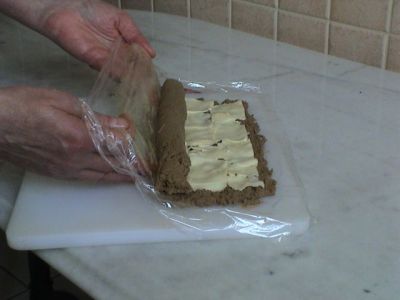 Осталось только завернуть рулет в плёнку и положить его в холодильник.