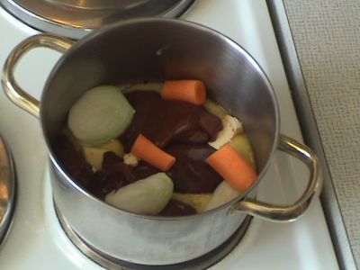 Печенку, маргарин, лук, морковку крупно нарезать и сложить в кастрюльку.