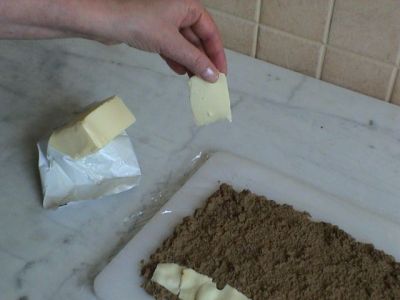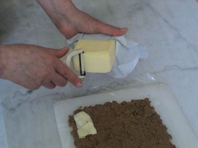 Теперь нужно нарезать масло. Я считаю, что удобнее всего это делать ножом для чистки овощей. Масло должно быть холодным.