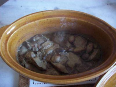Сложим в кастрюльку печень, добавим соль, перец и коньяк. Автор также советовала добавить две веточки тимьяна, но я этого не делала.