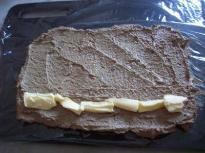 Выложила ещё тёплую массу на пищевую плёнку пластом толщиной в палец и разложила по краю небольшие брусочки масла.
