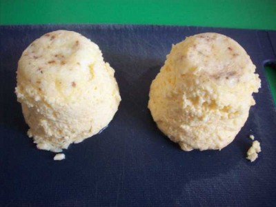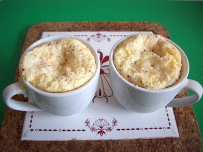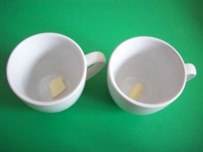 Достанем из шкафа две кофейные чашечки и смажем их слегка сливочным маслом. Для этого достаточно положить в каждую по маленькому кусочку сливочного масла, поставить чашечки на 15-20 секунд в микроволновку, а потом размазать растопившееся масло кисточкой.
