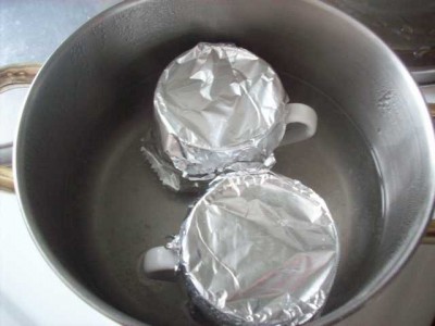 Закроем их фольгой и поставим в кастрюлю с кипящей водой. На водяной бане нашему омлету предстоит вариться 20 минут. На последние 5 минут стоит закрыть кастрюлю крышкой, чтобы верхняя часть омлета не оказалась жидкой.