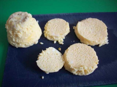 И выложим омлет на досточку. Вынимается он довольно легко. Достаточно провести зубочисткой вдоль стенок чашечки, чтобы омлет отделился и можно переворачивать чашечку.
