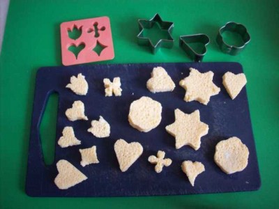 Вполне можно нарезать их ножом на кватратики, но раз уж мы решили сделать суп "нарядным", то возьмём маленькие формочки для печенья и устроим такую красоту.