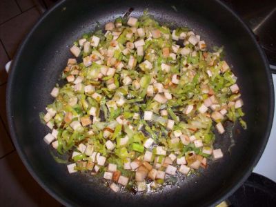 Ветчину нарежем небольшими кубиками, добавим к луку и все вместе еще немного обжарим.