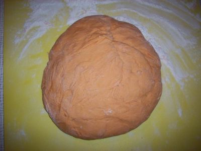 Выложим его на досточку, подсыпанную мукой и немного его помесим